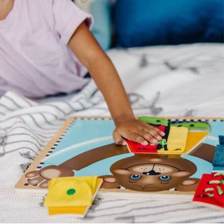 Getting dressed won’t be such a puzzle once zipping, buckling, snapping, lacing and tying, and other dressing skills are mastered. Each skill is contained on a separate, removable wooden puzzle piece for easy practice. Develop fine motor and life skills with this great activity.