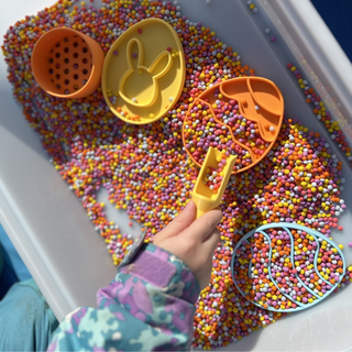 Lieldienu sensoro rotaļu komplekts- sensorie graudi, 3 Lieldienu olu formiņas, sietiņš un beramā karote