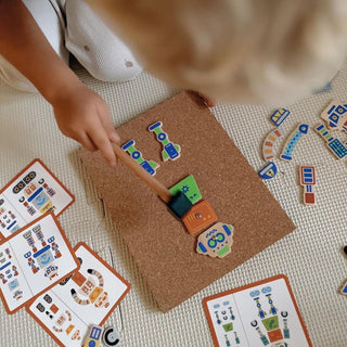 Creative work with a hammer and nails! The set includes a corkboard, wooden hammer, nails, and colorful pieces of wood! Picture one of the images on cards or follow flights of fancy! Hammering and arranging pieces develops motor skills, rendering pictures will take care of hand-eye coordination and logical thinking while creating a self-invented drawing will develop creativity! The packaging box is designed to store the game conveniently afterward!