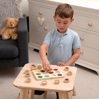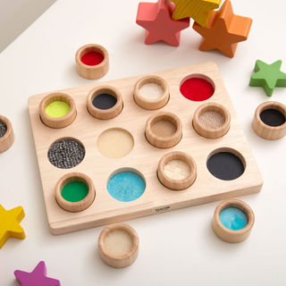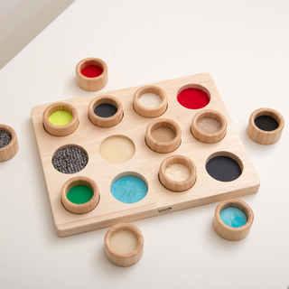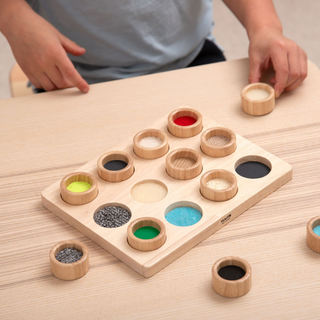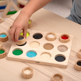Sajūti dažādas virsmas, lielais sensorais dēlītis piedāvā 12 dažāda seguma pārus! Sensorā spēle - pieskaries un savieno ir lielisks koncentrēšanās un sajūtu treniņš. Taustes atmiņas spēles mērķis ir novietot cilindru uz pamatnes atbilstošās virsmas, katru virsmu aptaustot un sajūtot dažādās tekstūras! Izpēti 12 dažādas virsmas un atrodi vienādās! Vienlaikus trenēsim arī koncentrēšanās spējas, acu-roku koordināciju un loģisko domāšanu. Viens no spēles veidiem ir muciņas novietot ar koka virsmu uz augšu, tādējādi bērnam neredzot virsmas. Pataustīt virsmu un taustot dēlīti, censties atrast vienādās sajūtas. Kad pāris atpazīts, apgriežam muciņu ar skatu uz augšu un redzam, vai izdevies pareizi.